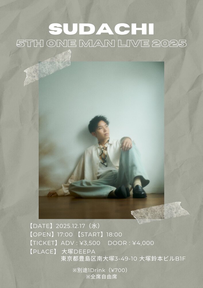 Sudachi 5th One man Live 2025 SCHEDULE 2025/12/17(水) 17:00 - 東京 / 大塚Deepa 地図を表示 開場 : 17:00 / 開演 18:00 前売り ¥3,500 当日¥4,000 すだち さん Sudachi 5th One man Live 2025 サポートで出演させていただきます。 詳細/オンライン予約 URLをコピーする 報告する