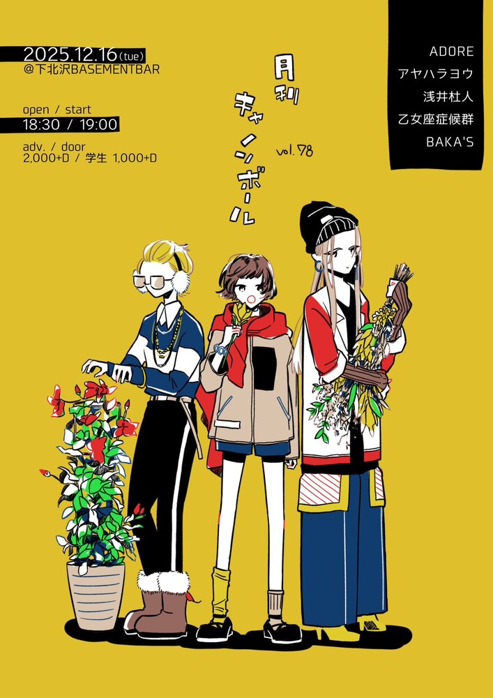 月刊キャノンボール vol.78 SCHEDULE 2025/12/16(火) 18:30 - 下北沢 BASEMENTBAR 地図を表示 OPEN 18:30 / START 19:00 前売り¥2,000 / 学割 ¥1,000 (1D代別) 12月16日(火) 月刊キャノンボール vol.78 アヤハラヨウ さんサポートで出演させていただきます。 詳細/お取り置き URLをコピーする 報告する